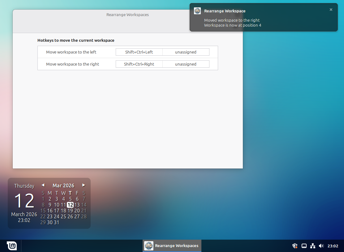 A Cinnamon extension that allows you to define hotkeys which will move the current workspace to the left or to the right in the workspace list.